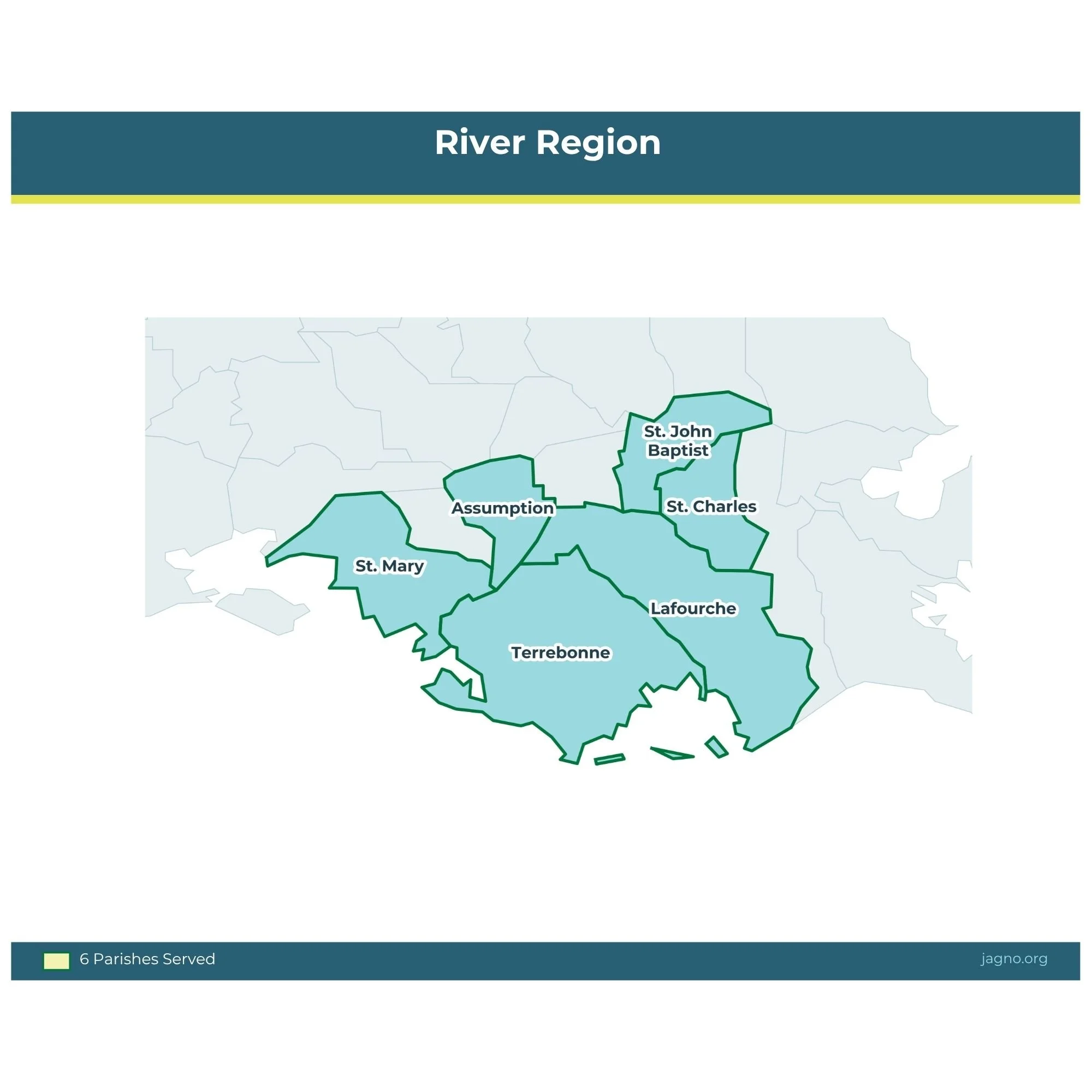 The River Region consists of St. Charles, St. John, St. Mary, Lafourche, Terrebonne, and Assumption parishes.