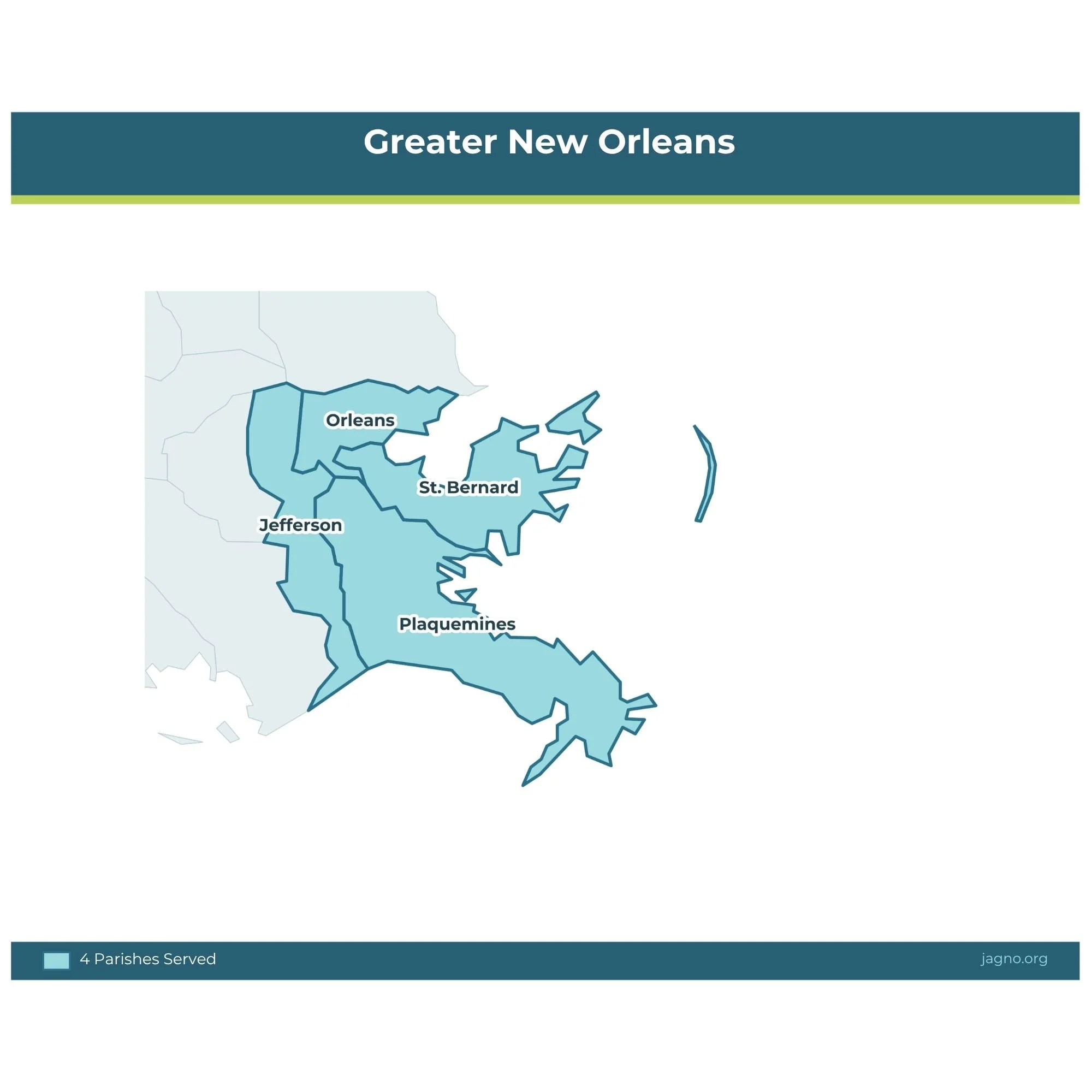 The Greater New Orleans area consists of Jefferson, Orleans, Plaquemines, St. Bernard parishes.