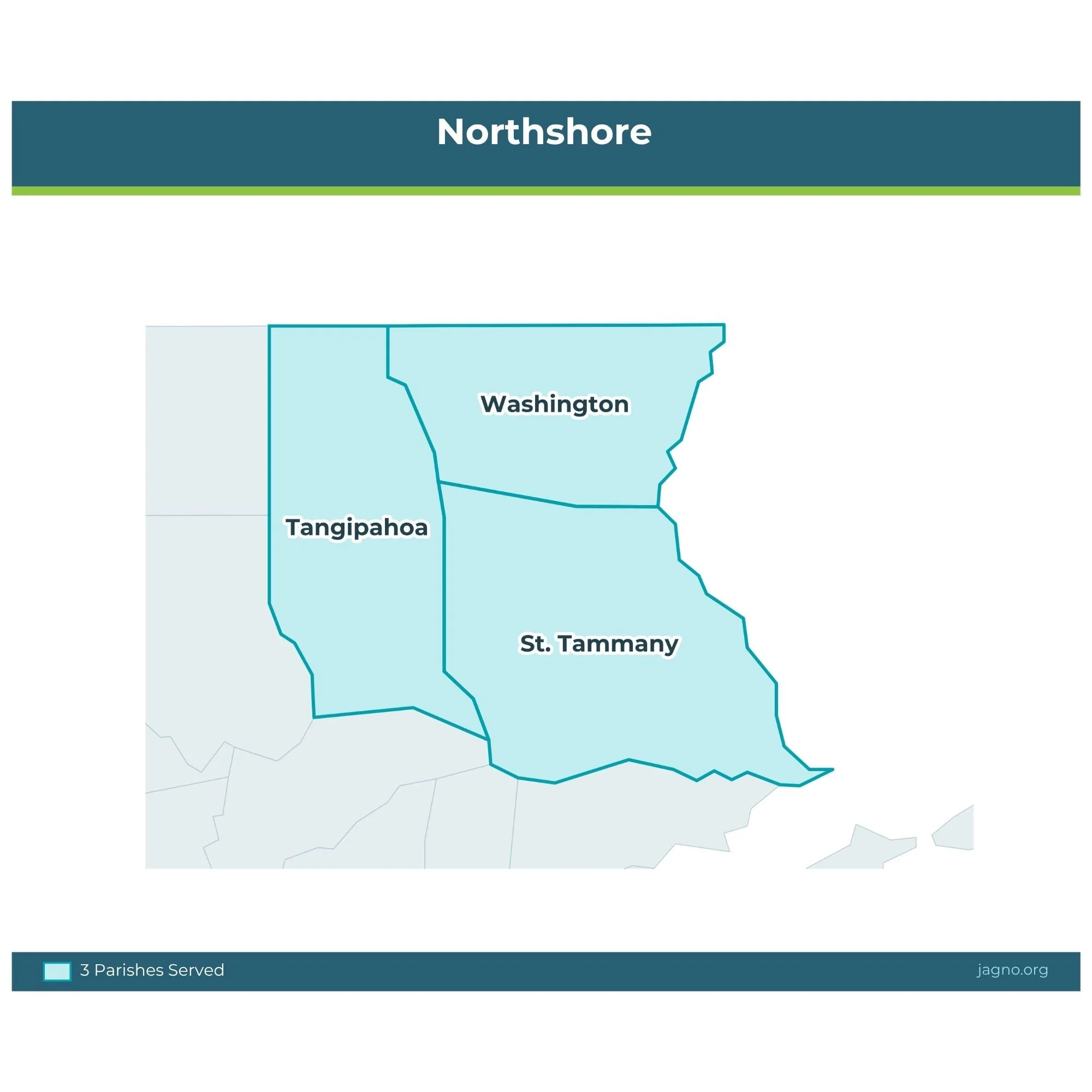 The Northshore area consists of St. Tammany, Tangipahoa, and Washington parishes.