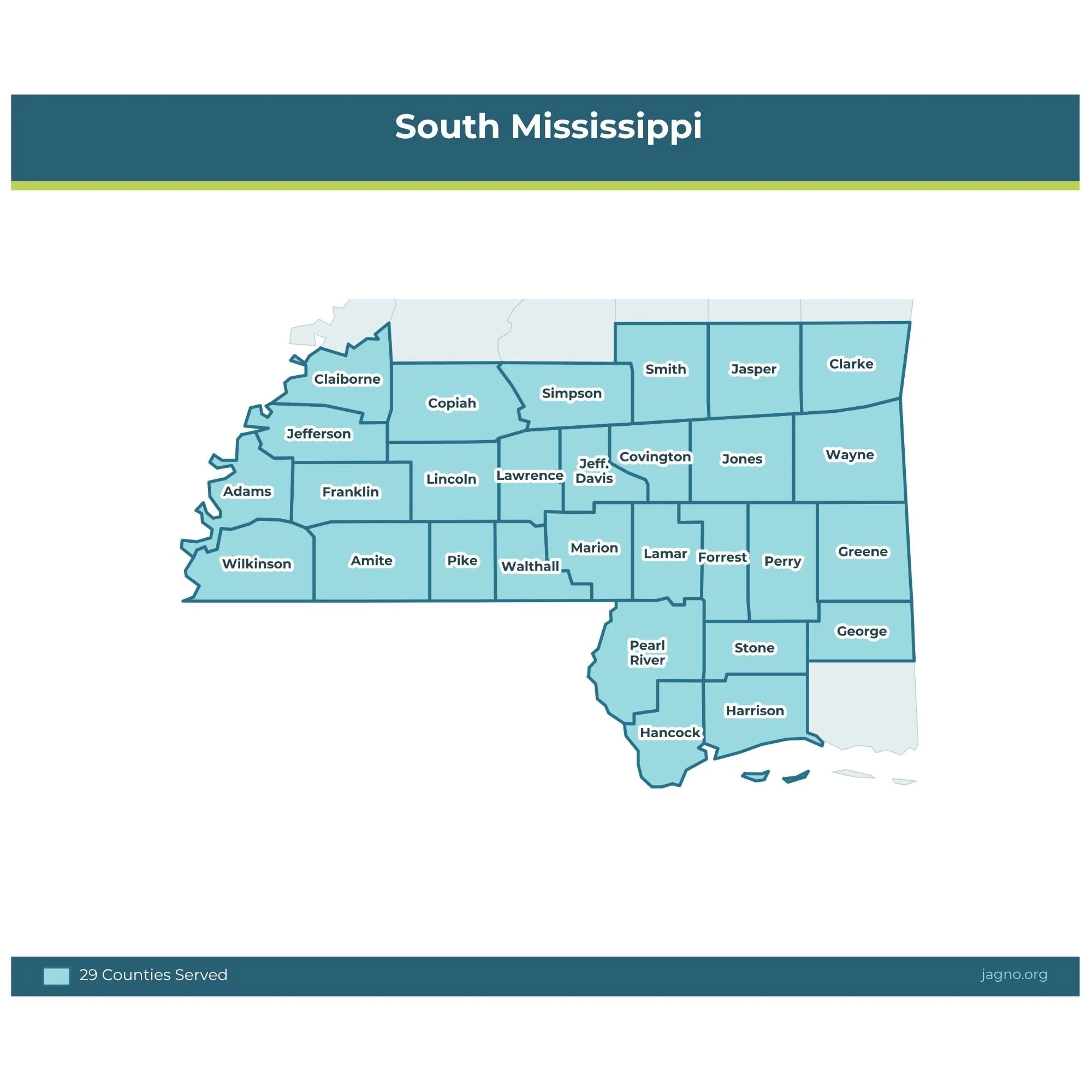 The Mississippi Region consists of Adams, Amite, Claiborne, Clarke, Copiah, Covington, Forrest, Franklin, George, Greene, Hancock, Harrison, Jasper, Jefferson, Jefferson Davis, Jones, Lamar, Lawrence, Lincoln, Marion, Pearl River, Perry, Pike, Simpson, Smith, Stone, Walthall, Wayne and Wilkinson counties.